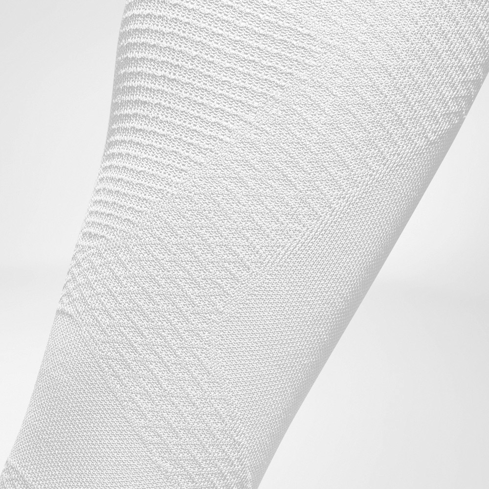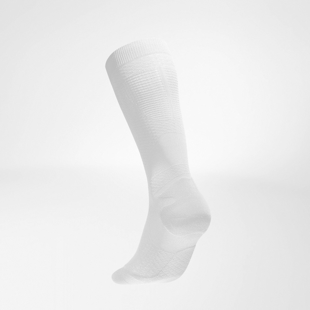 De Run Ultralight Compression Socks combineren de beste eigenschappen van lichte sportcompressiekousen: het ultradunne breiwerk is bijzonder ademend en zorgt zo voor een aangenaam loopgevoel, ook op warme dagen. Geïntegreerde compressiezones ondersteunen de kuitspieren en stabiliseren het spronggewricht en de voet. Unieke compressiezones aan de kuit verminderen spiertrillingen en bevorderen de bloedcirculatie. Daardoor worden de spieren tijdens het hardlopen minder snel moe en blijven er meer vrije energiereserves over. De "Infinity Zone" voorkomt overbelasting: ze tilt de voetholte lichtjes op en ondersteunt het spronggewricht met lichte druk. De comfortzones "Relief Sole" en "Heel Protection" beschermen de voetzool en verminderen de drukbelasting op de hiel wanneer de voet in de loopschoen neerkomt. De uitsparing "Achilles Comfort" ontlast de achillespees en voorkomt overprikkeling in dit gevoelige gebied.